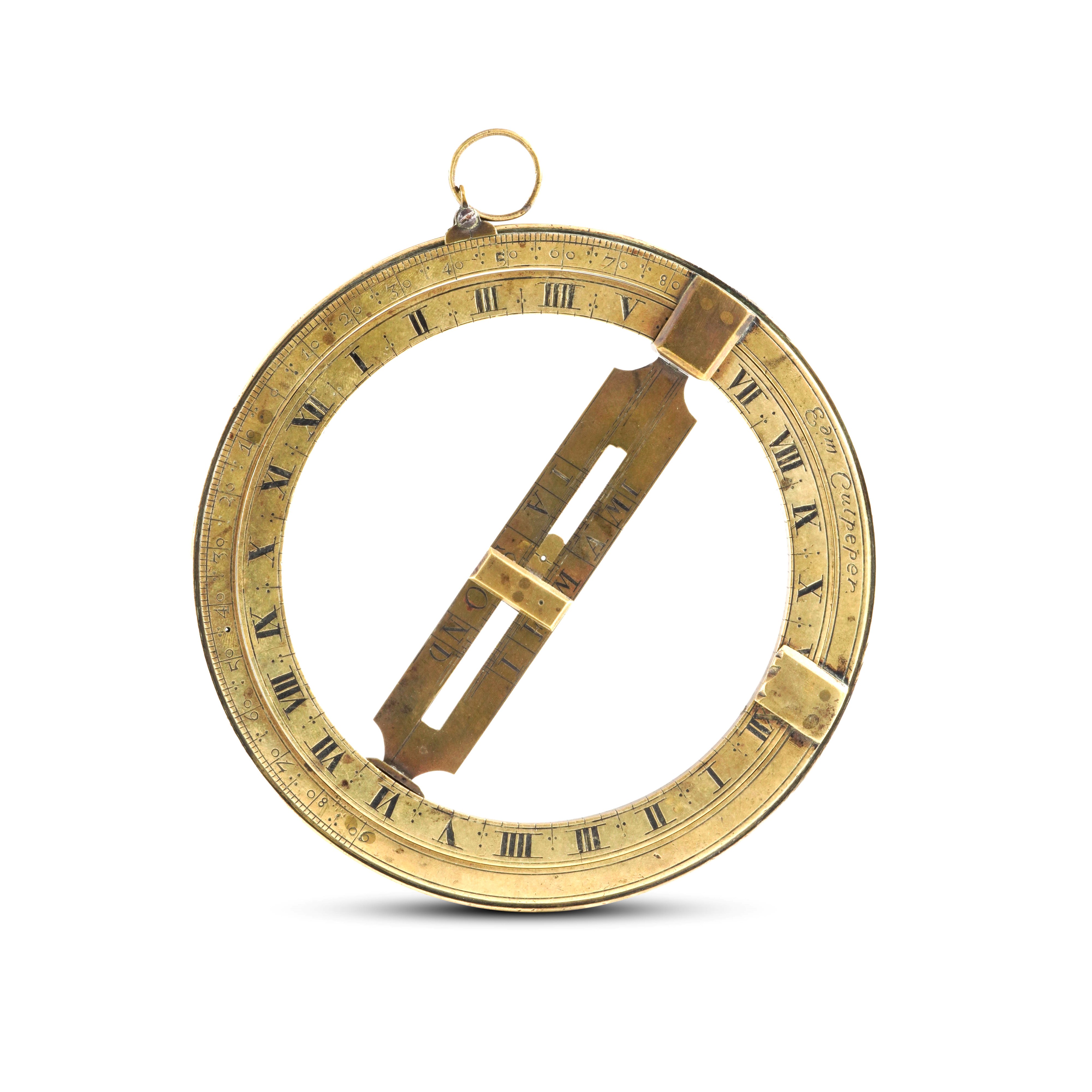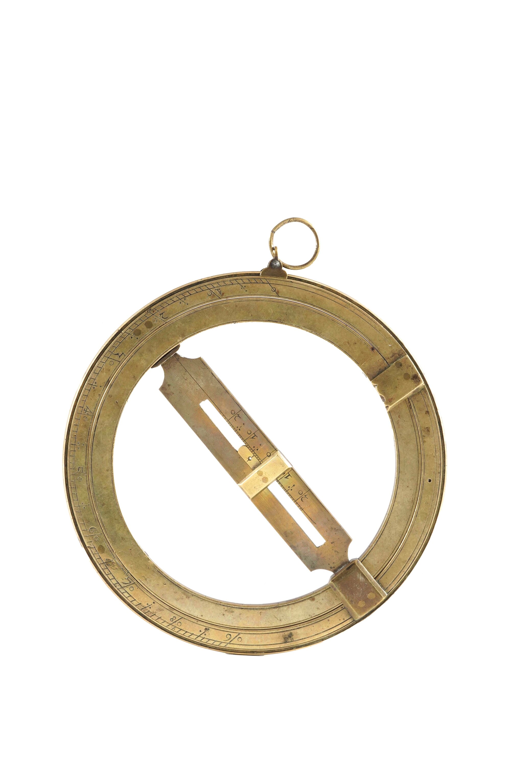 Anello solare equinoziale in ottone. Probabilmente Inghilterra XVIII-XIX secolo, monogramma A.E.