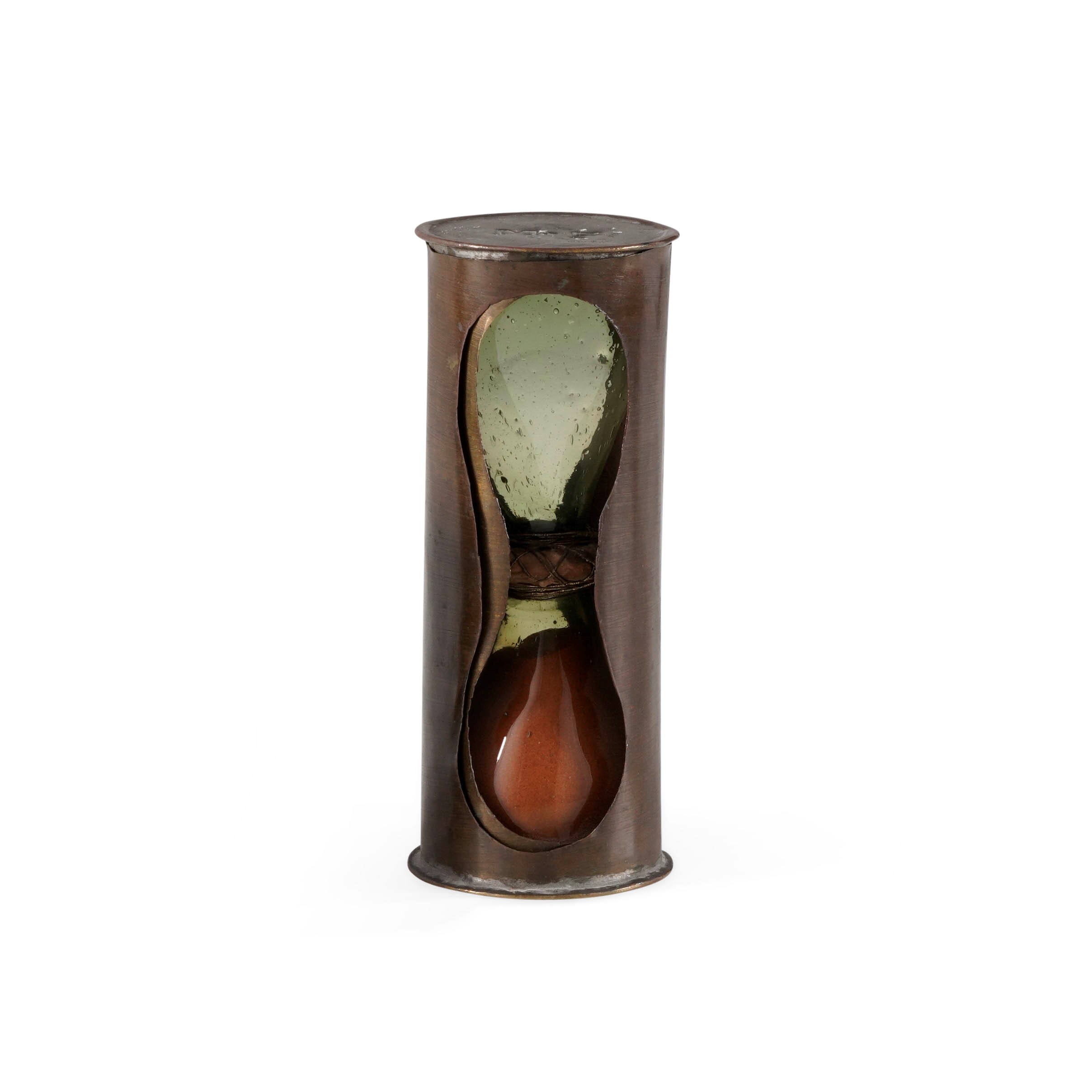 Clessidra da viaggio in ottone e vetro. Siglata M.F. XVIII secolo