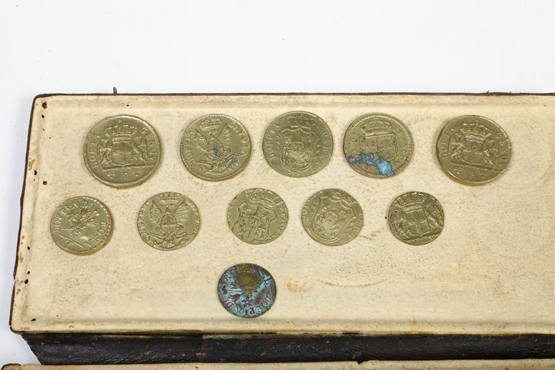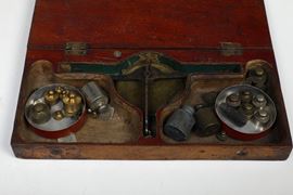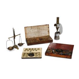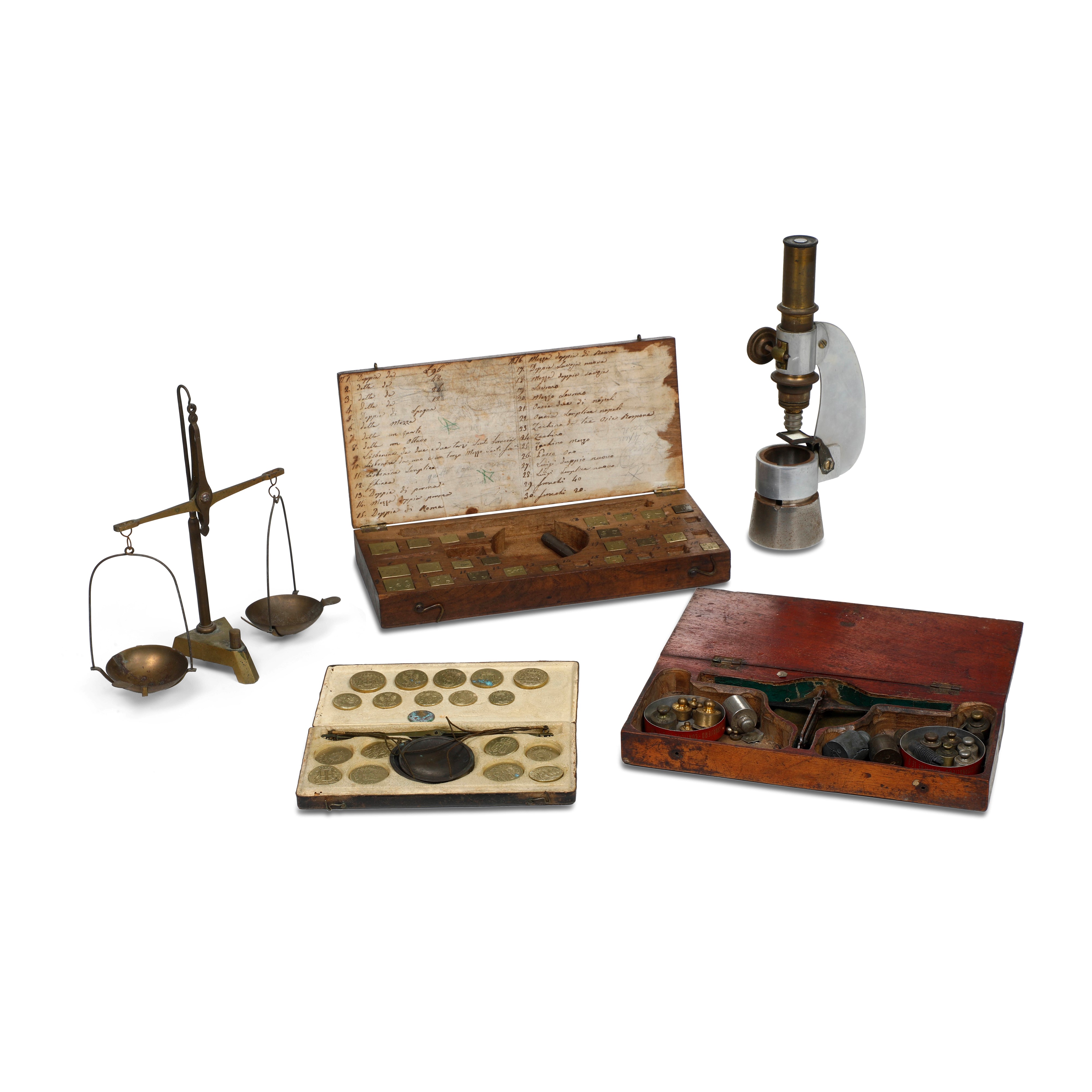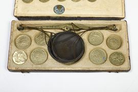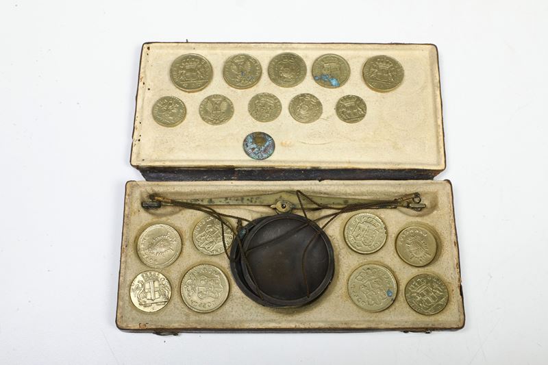 Due bilancini con custodia e pesetti, un bilancino, una custodia con soli pesetti