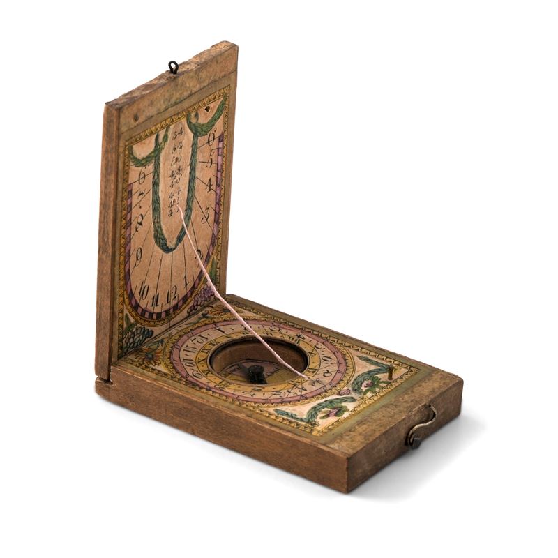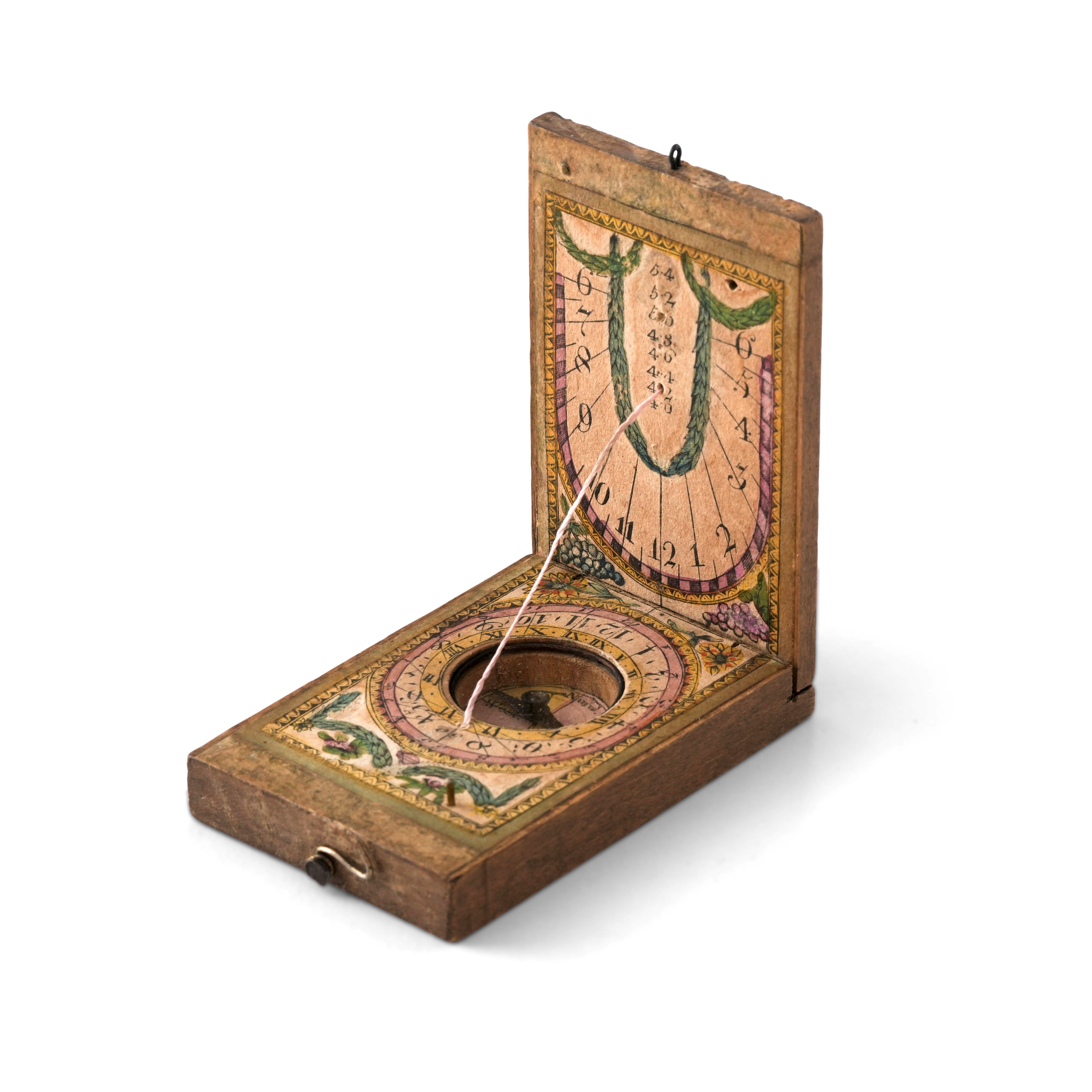 Orologio solare dittico da viaggio in legno e carta dipinta. XVIII secolo