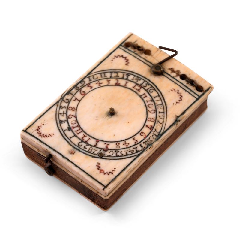 Manca sul coperchio la volvella di ottone per la conversione delle ore lunari in ore solari.