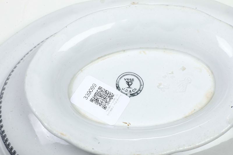 Terraglia. Marca: simbolo grafico con "Vase J.D &Co". Dimensioni: altezza cm 8,5; cm 24x22; cm 43x29. Conservazione: manico del piatto con sbeccatura; qualche segno di ossidazione e usure all'oro.