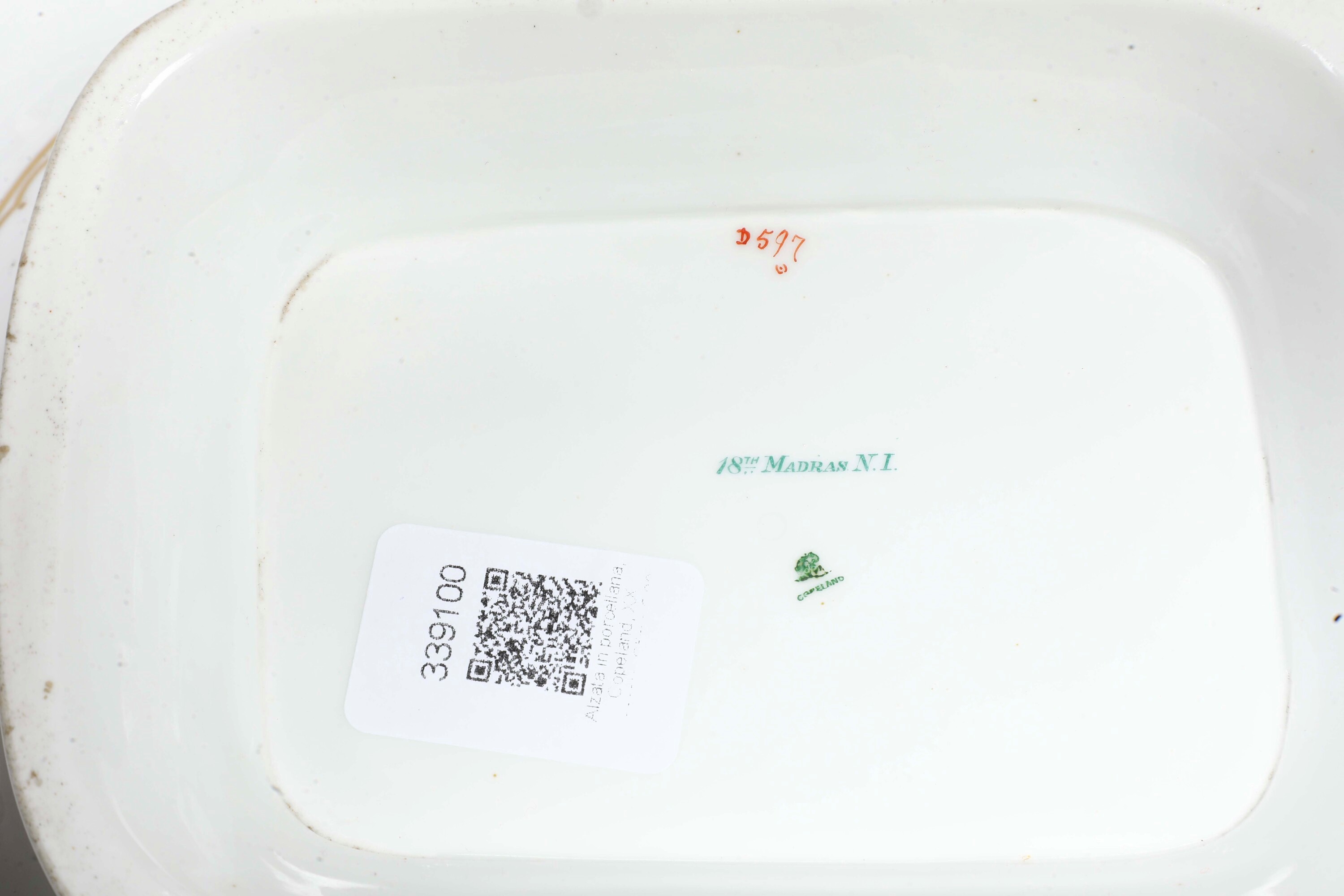 Porcellana. Marca: simbolo grafico e "Copeland". Dimensioni: altezza cm 6; cm 31x24,5. Conservazione: ottima; qualche usura all'oro.