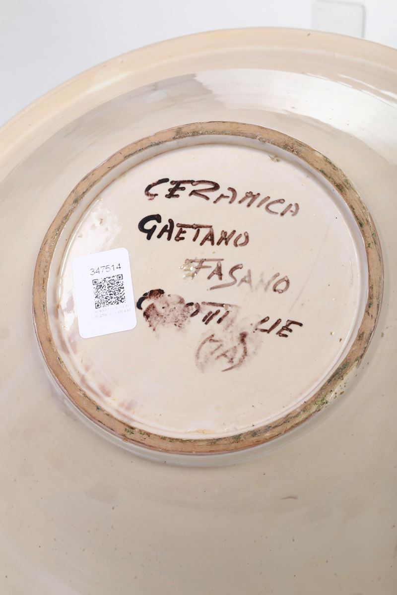 Maiolica. Marca: "Ceramica Gaetano Fasano Grottaglie". Dimensioni: altezza cm 14; diametro cm 36 . Conservazione: ottima