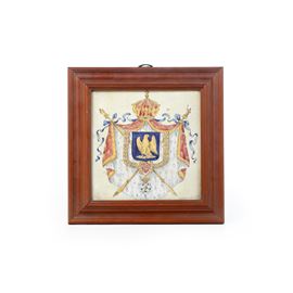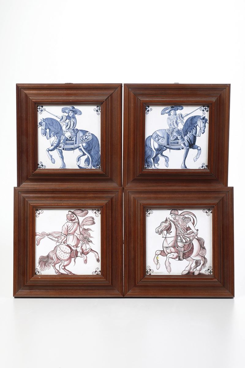 Maiolica. Dimensioni: mattonella con stemma (cm 20x20); mattonelle con soggetto ippico (cm 14x14). Conservazione: ottima. Cornici in legno.