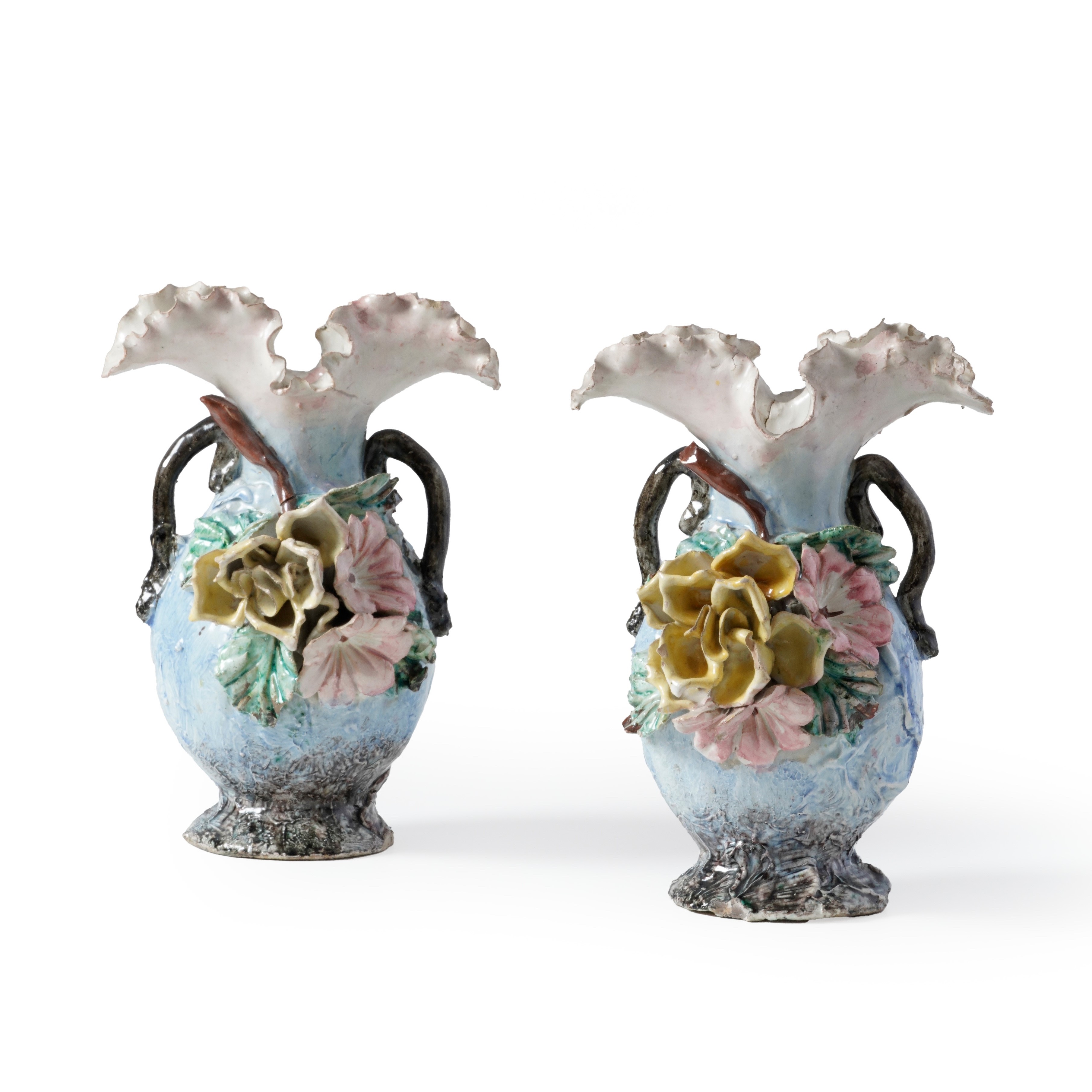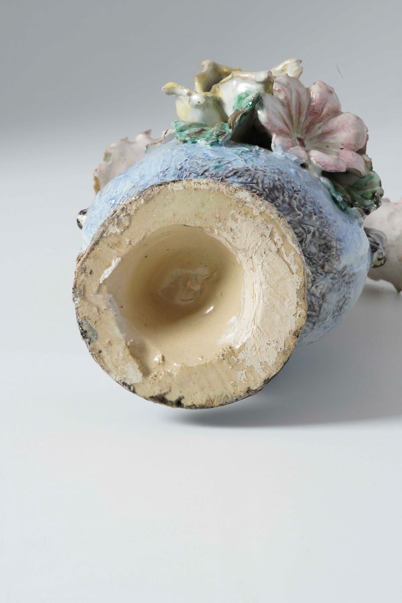 Maiolica. Marca: assente. Altezza cm 29. Conservazione: sbeccature al piede dei due vasi; piccole mancanze ai fiori.