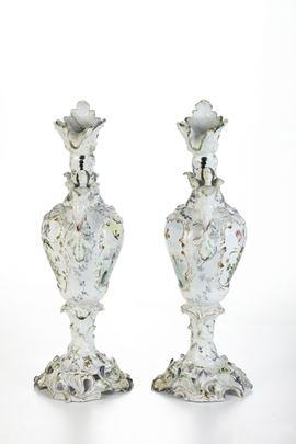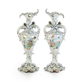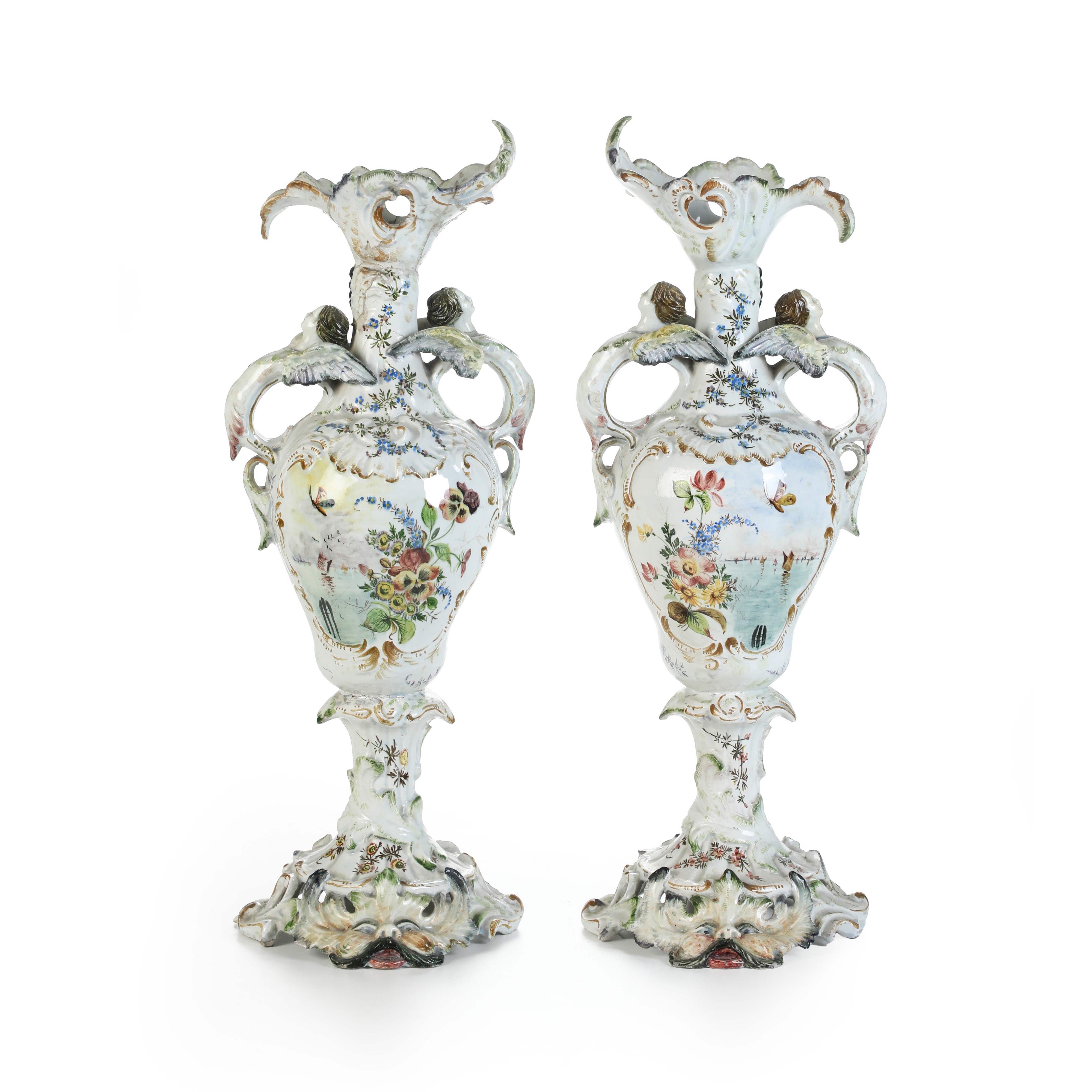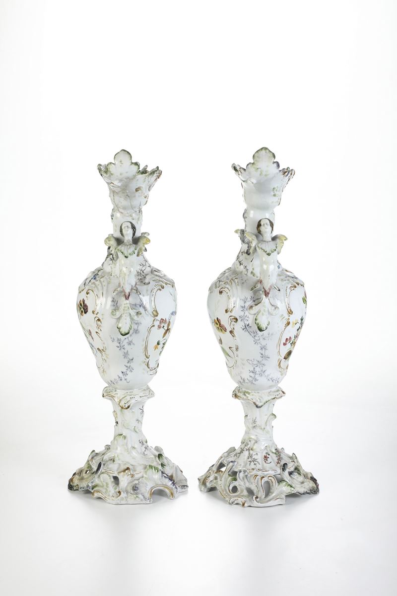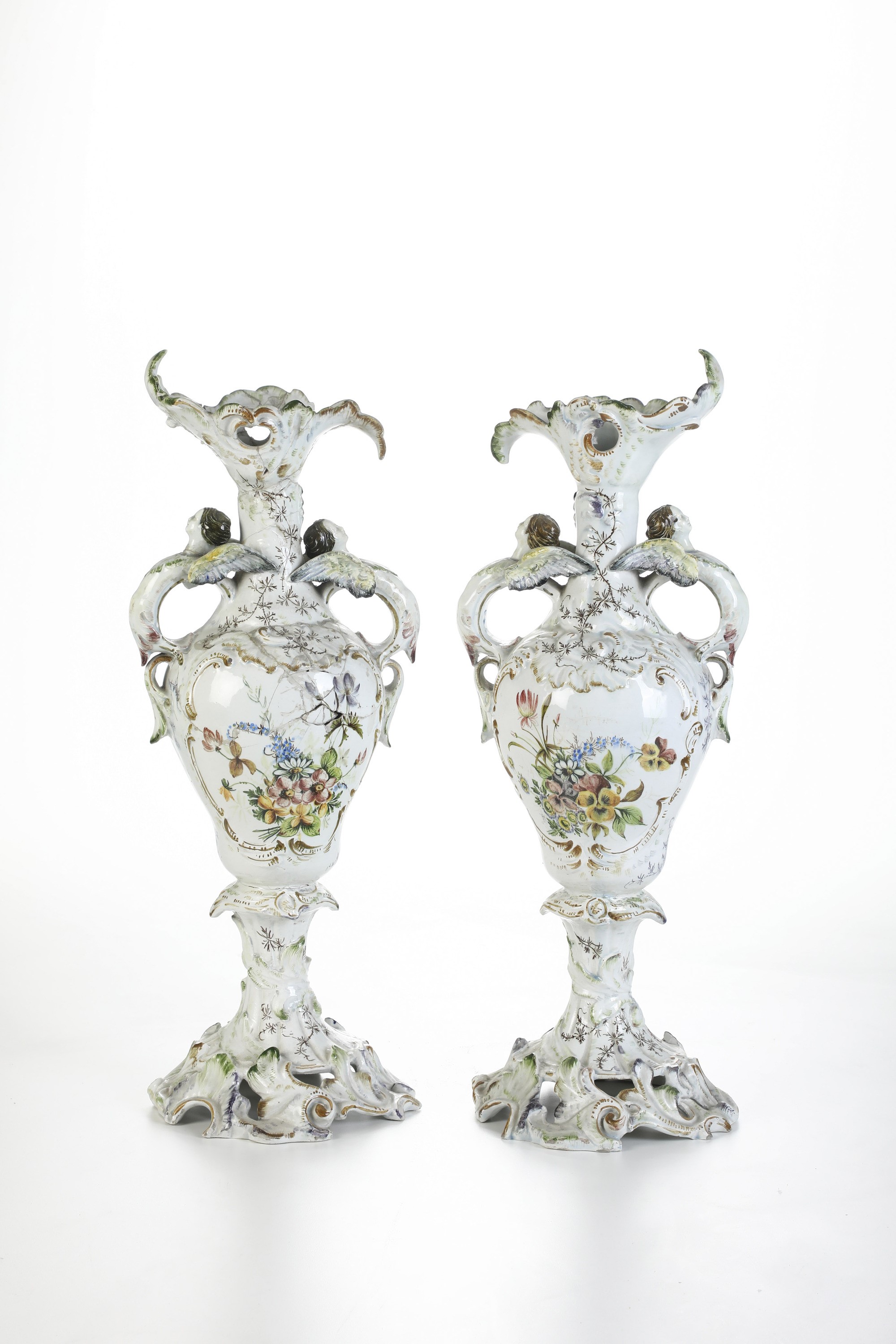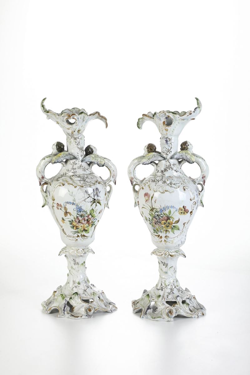 Terraglia. Marca: assente. Altezza cm 54 circa. Conservazione: un vaso in ottimo stato, l'altro rotto in più frammenti e incollato.