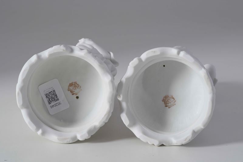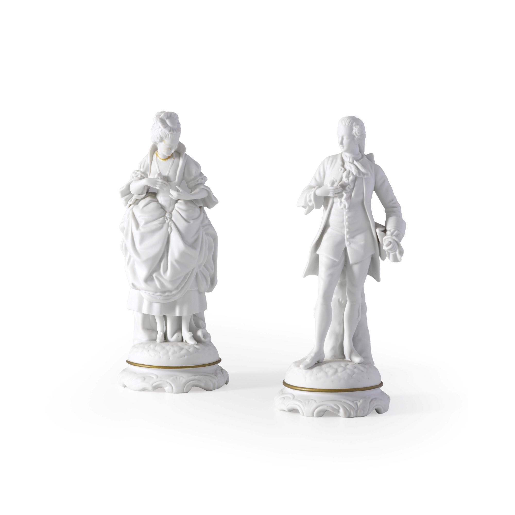 Porcellana bisquit. Marca: stemma araldico con corona. Altezza cm 28. Conservazione: dama con testa rotta e incollata
