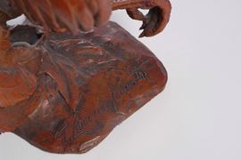 Terracotta smaltata. Marca: firma "Cacciapuoti" incisa. Altezza massima cm 27. Conservazione: una zampa rotta e incollata; piccole sbeccature alle piume posteriori