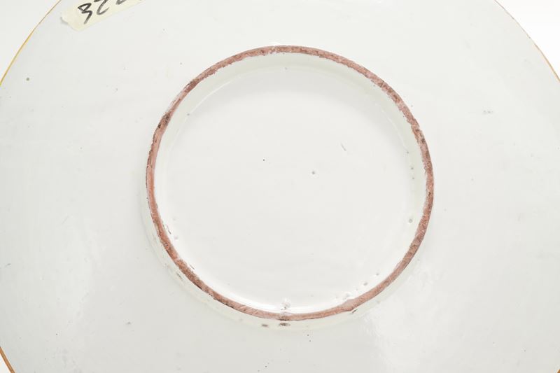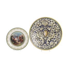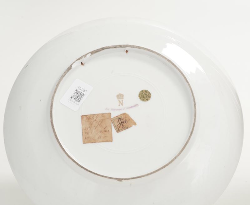 Porcellana e maiolica. Marca: "N" con corona e didascalia "En bivouac d'Austerlitz" sul piatto in porcellana. Dimensioni: diametro cm 30; cm 43. Conservazione: il piatto in porcellana con diverse sbeccature al bordo e usure all'oro.