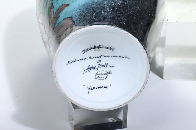 Porcellana di Limoges dipinta in policromia e oro. Marca: Limoges in verde e firma dell'autore; "dipinto a mano: tecnica 3º fuoco e oro zecchino; 1/1. Altezza cm 46,7. Conservazione: ottima