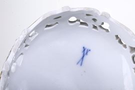 Porcellana. Marca: spade in blu. Dimensioni: altezza cm 19; cm 18,5x15,5. Conservazione: ottima; restauri minori alla vegetazione; a una mano del flautista e al terminale del flauto; all'arpa.