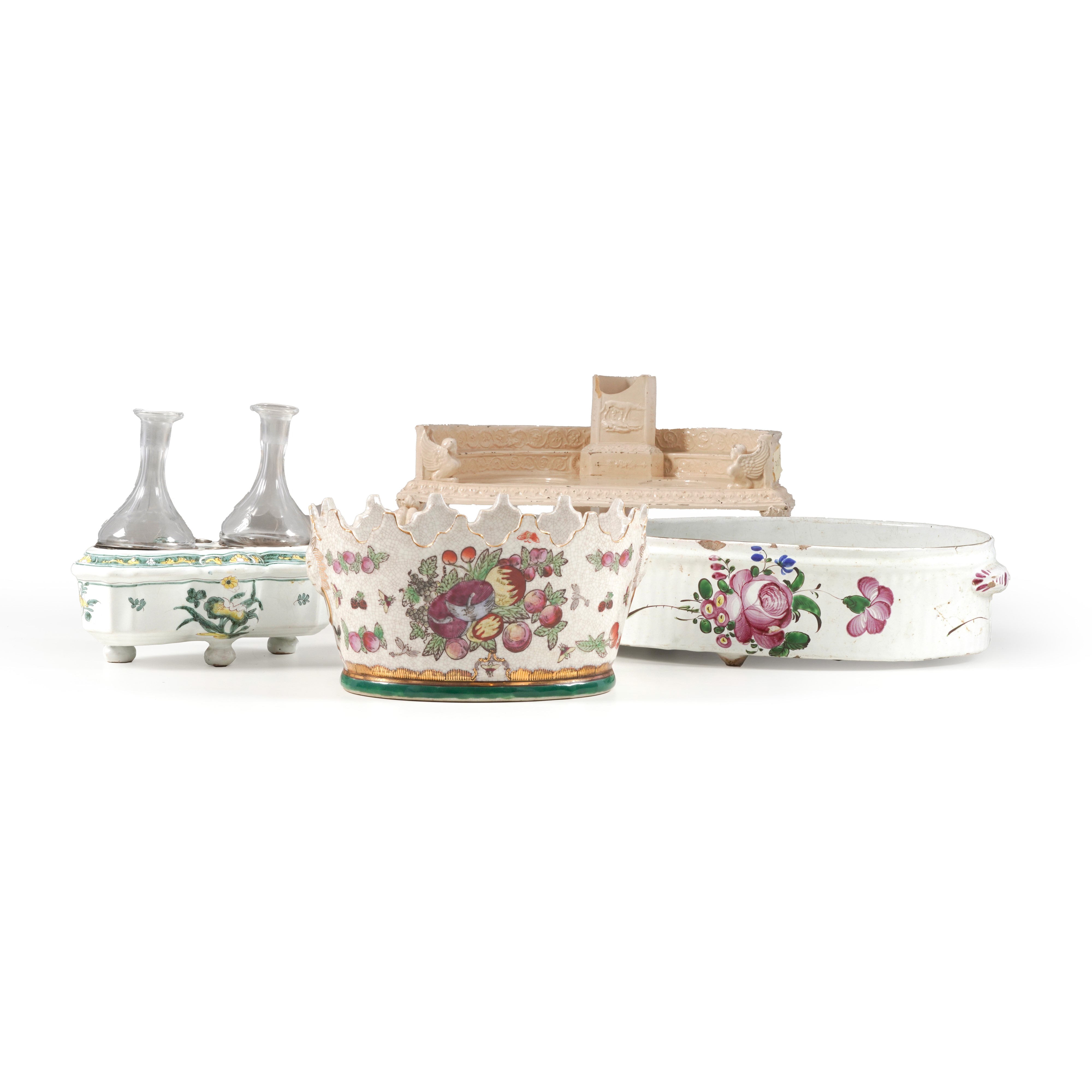 Al lotto si aggiungono: una bacinella in maiolica, (Francia, XVIII-XIX secolo), un calamaio in terraglia (parte mancante e rottura), una rinfresca calici in porcellana