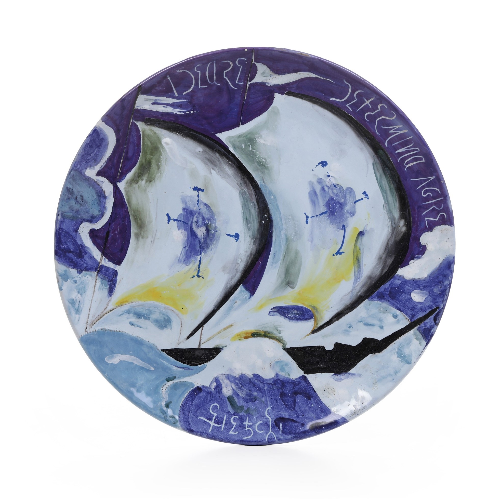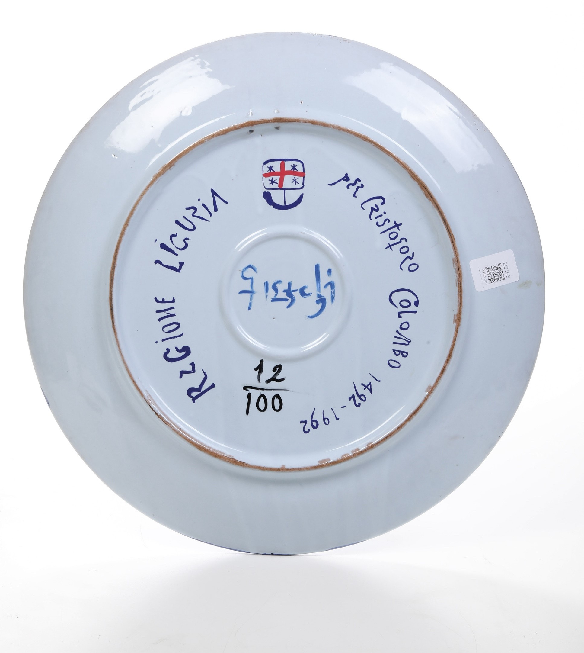 Maiolica con decorazione astratta policroma di una caravella. Firma: "G. Fieschi". Scritte: "Regione Liguria per Cristoforo Colombo 1493-1992"; "12/100" (per dodicesimo esemplare su cento). Diametro cm 41. Conservazione: ottima.