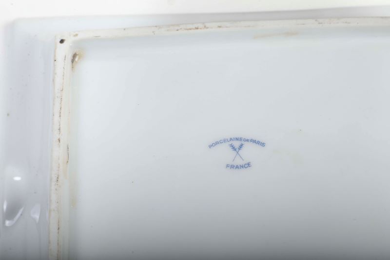 Porcellana decorata da pittore indipendente. Marca: due frecce incrociate con "Porcelaine de Paris France"; marca apocrifa di Hermès. Dimensioni: cm 18x16. Conservazione: ottima