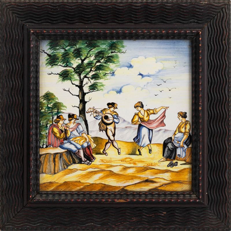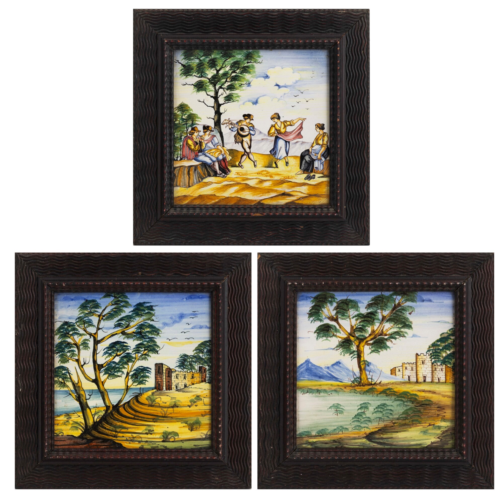 Tre piastrelle con paesaggi e figure. Deruta, XX secolo.