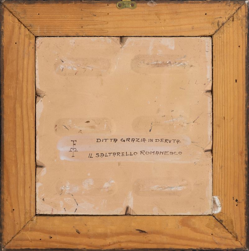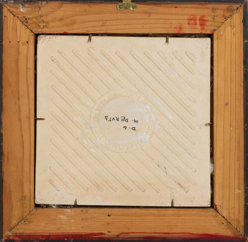 Maiolica. Marca: "D.C. Deruta". Dimensioni placche: cm 19x19 Conservazione: ottima. Cornici in legno (dimensioni cm 28x28)
