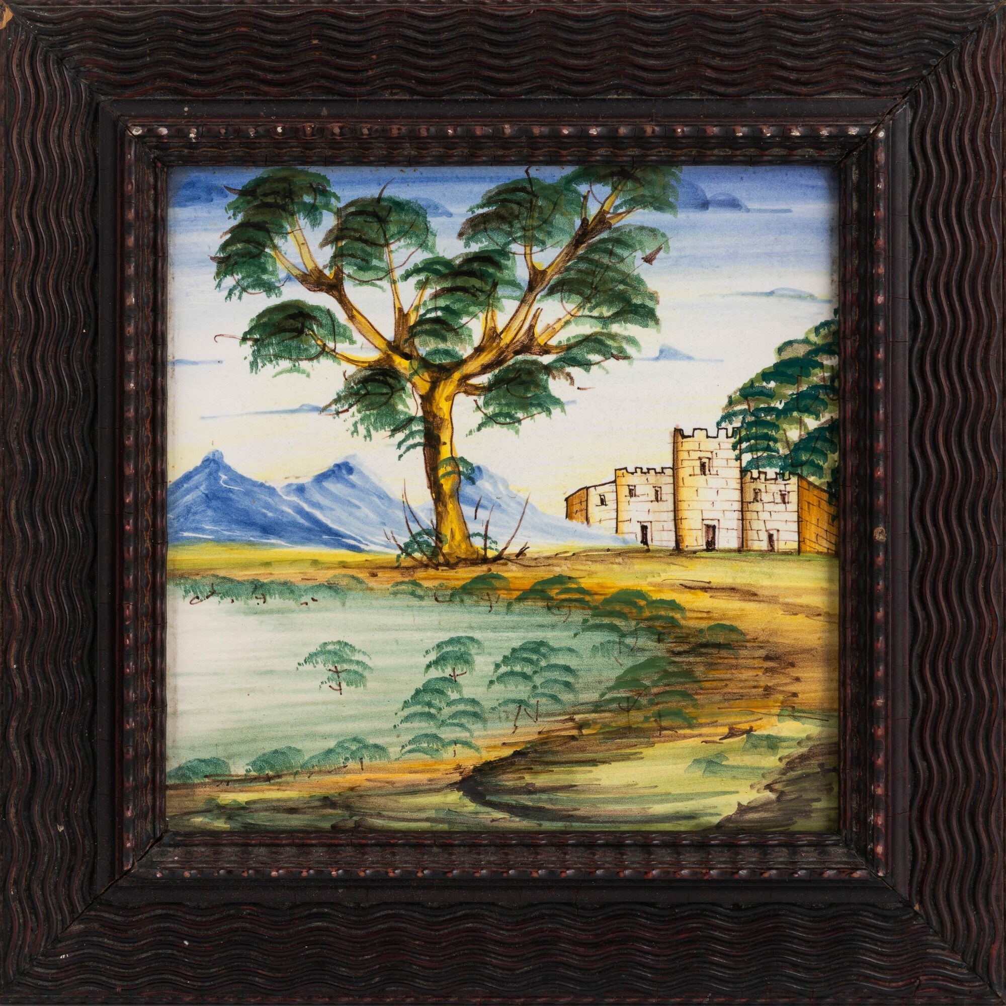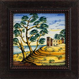 Tre piastrelle con paesaggi e figure.