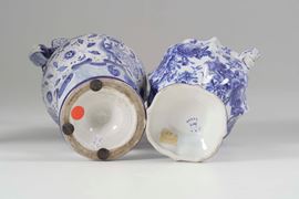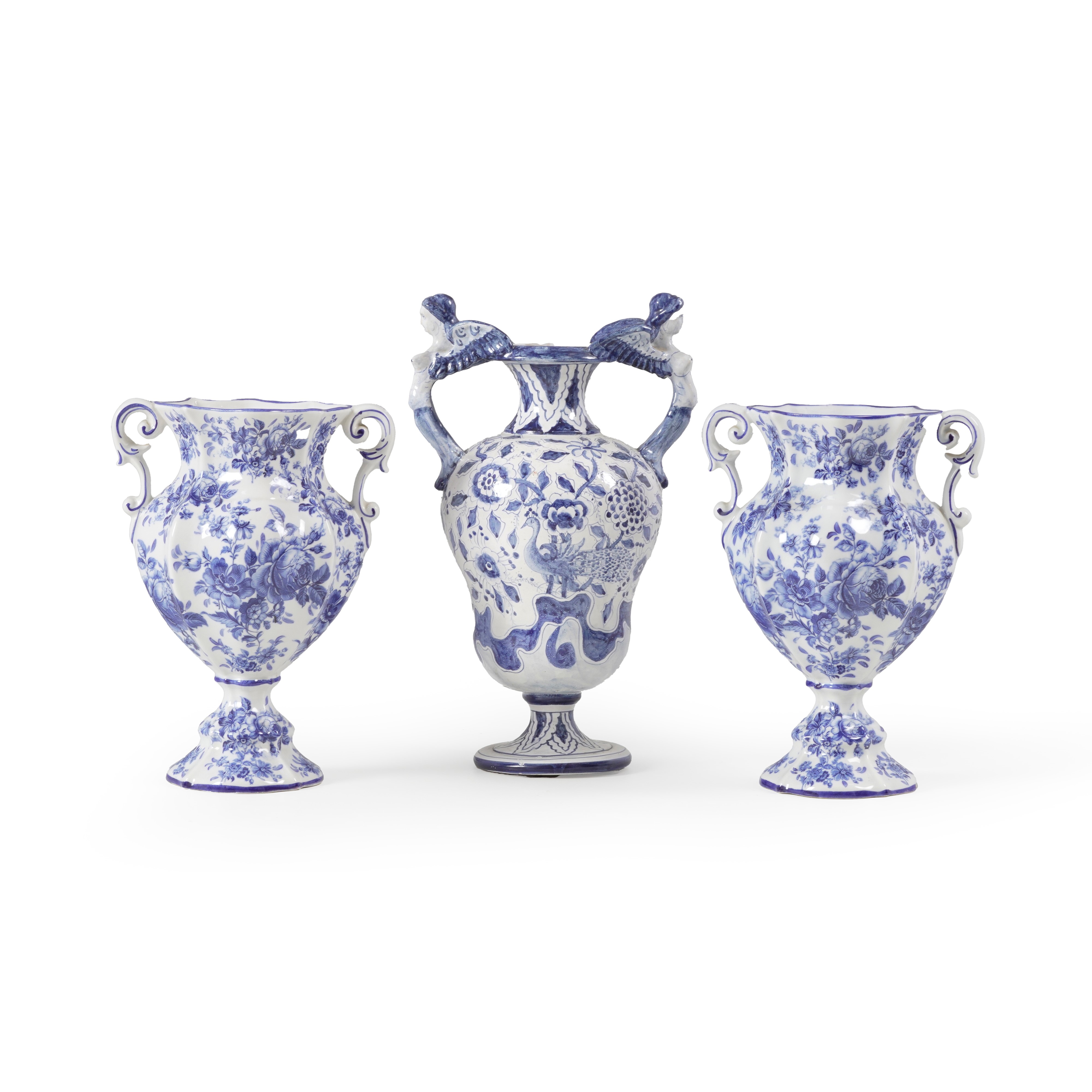 Porcellana e maiolica. Altezza cm 27. Conservazione: una piccola sbeccatura al piede di uno dei due vasi in porcellana.