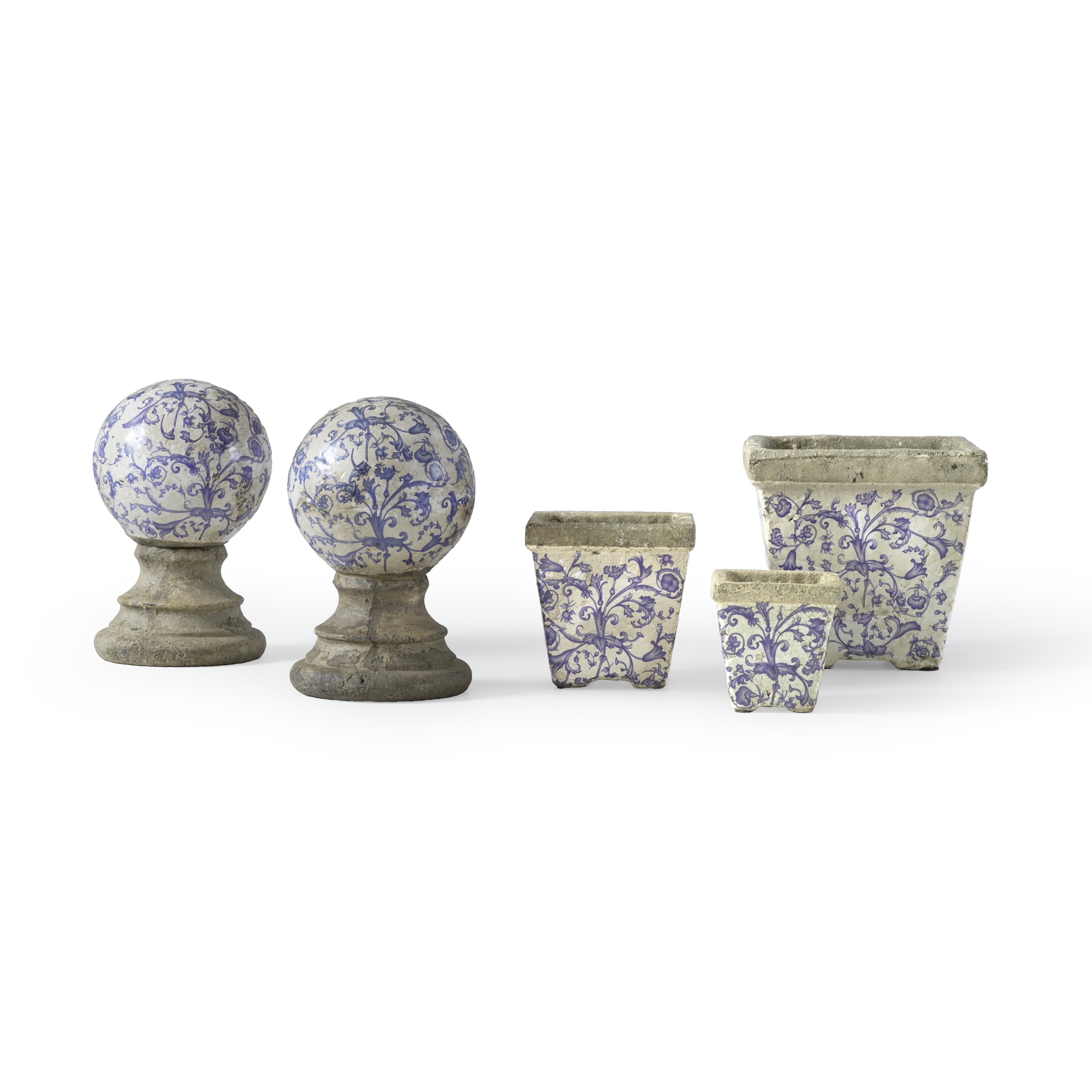 Maiolica. Dimensioni: altezza massima dei vasi cm 19; altezza globi cm 24,5. Conservazione: ottima nel complesso, qualche caduta di smalto.