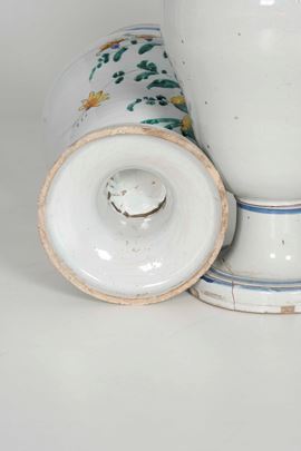 Maiolica. Marca: assente. Altezza cm 32. Conservazione: due piedi rotti in più frammenti e incollati; piccole sbeccature al bordo superiore