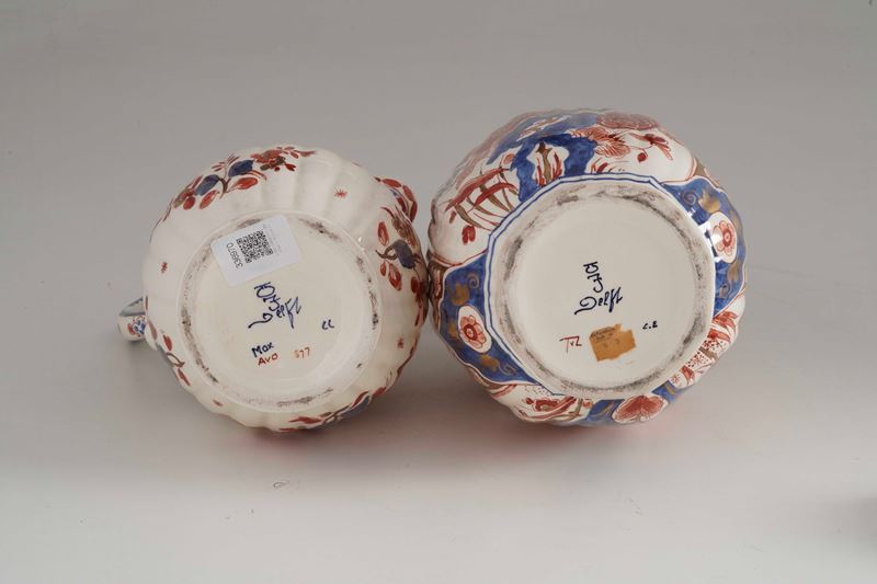 Terraglia. Marca: "Delft" in blu. Altezza massima cm 39. Conservazione: bottiglia rotta a metà e incollata; brocca con una parte del manico rotto e incollato.