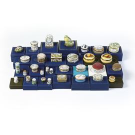 Ventisei scatoline, ditali e un orologio. Inghilterra, Halcyon Days Enamels, fine del XX secolo.