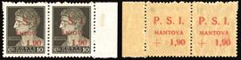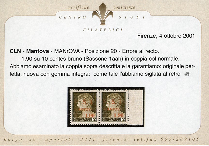 CLM - MANTOVA 1945 - 1,90 lire su 10 cent., soprastampa recto-verso, al recto varietà "MANrOVA", in coppia con il normale [..]