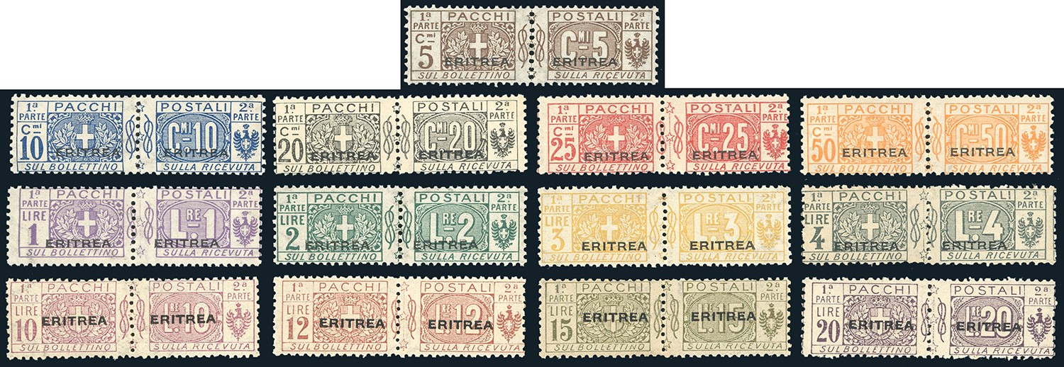 COLONIE ITALIANE - ERITREA PACCHI POSTALI 1917/24 - Nodo di Savoia al centro, soprastampa grande, serie completa (9/21)