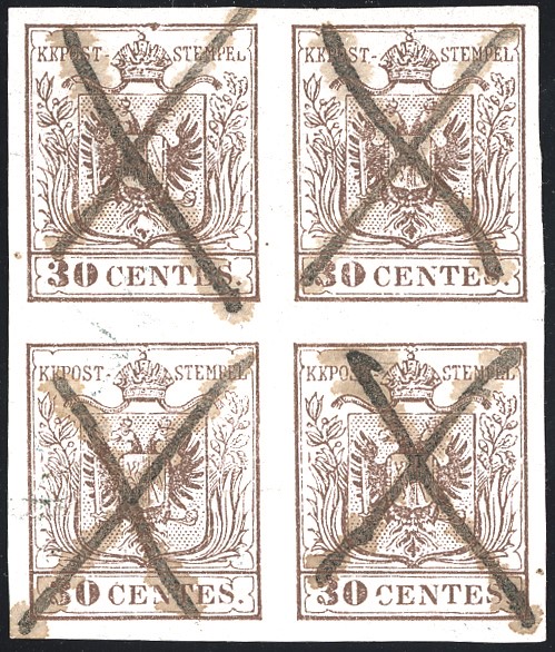 LOMBARDO VENETO 1850 - 30 cent. bruno chiaro, I tipo, carta a mano, prima tiratura (7a), blocco di quattro