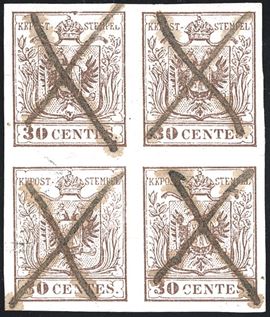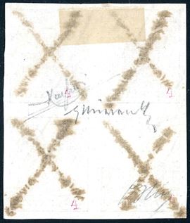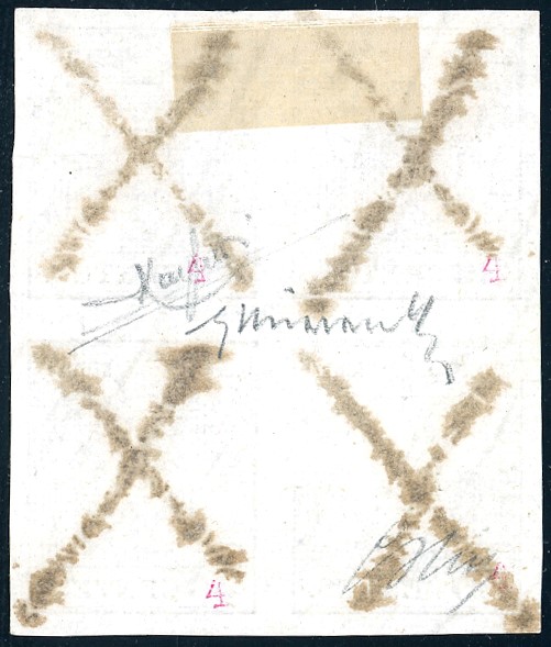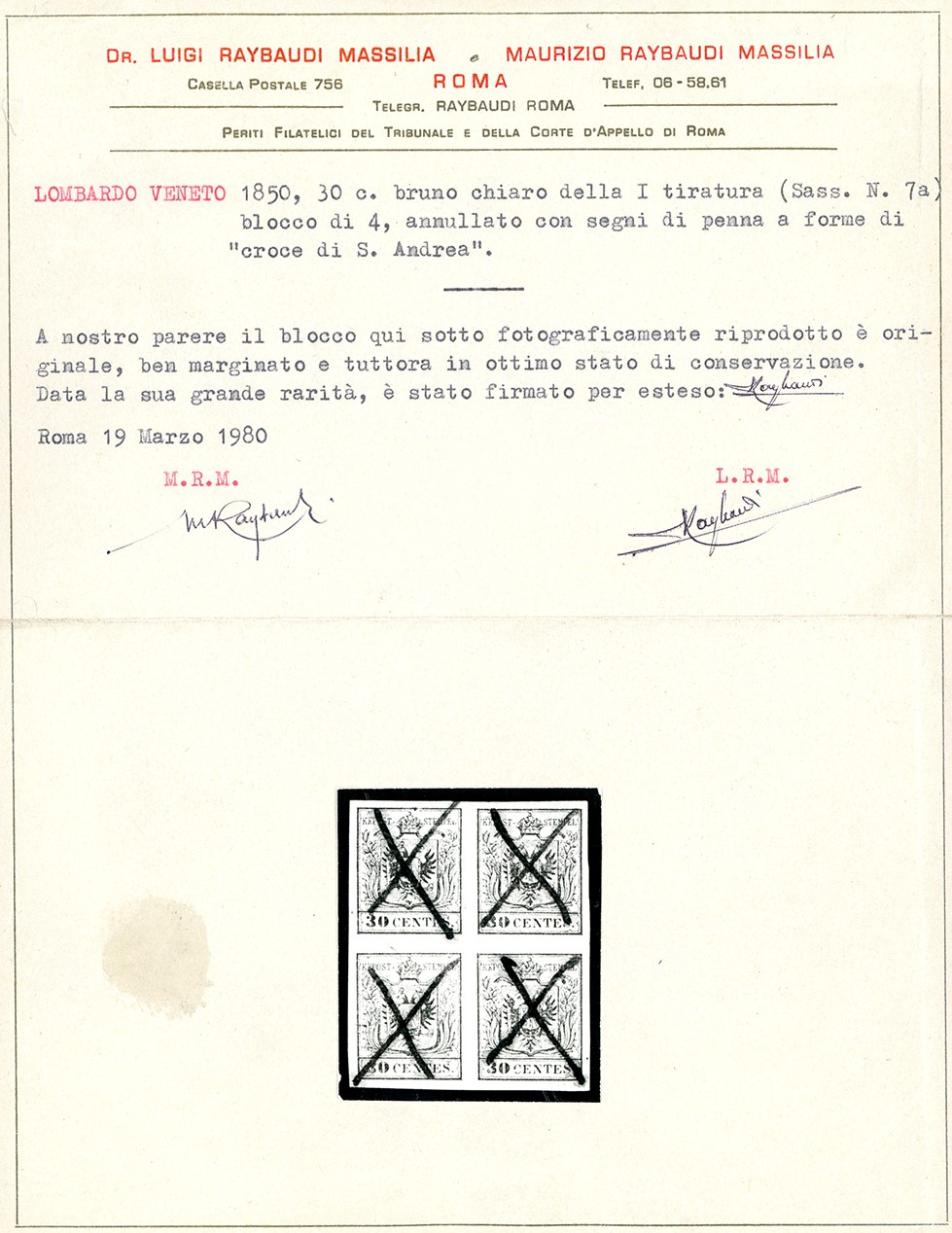 Il blocco proviene dal foglio inizialmente completo di 240 esemplari ora conservato al museo postale di Vienna. Si conoscono solo altri due blocchi di quattro ed un blocco di otto (tutti annullati con le croci di S.Andrea) in collezioni private. Importante rarità della I emissione, da esposizione. G.Oliva, Chiavarello, cert. Raybaudi. Cat. € 84.000+