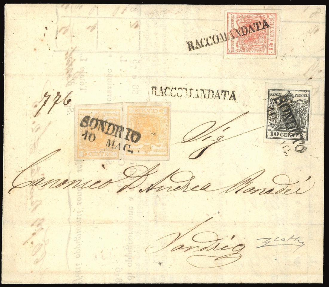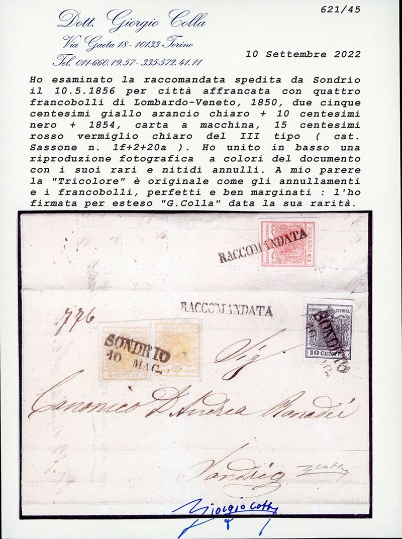Perfetti, su lettera raccomandata di doppio porto da Sondrio 10/5/1856 per città. Rara affrancatura tricolore, impreziosita dalla pregevole tariffa. Cert. Colla.