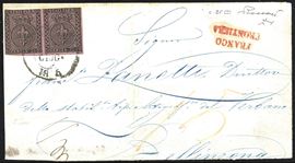 PARMA 1852 - 25 cent. violetto (4), coppia orizzontale, su lettera, parzialmente incompleta al verso, da Parma 19/6/1852 a Bellinzona