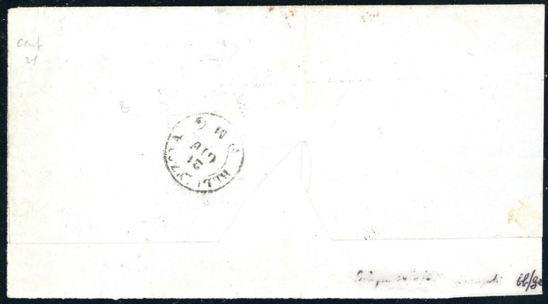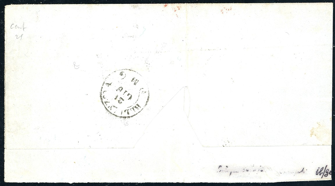 Bollo d'arrivo, affrancata fino al confine per 50 cent. e tassata in arrivo. Affrancatura molto rara e destinazione di pregio. Vaccari, Chiavarello. Cat. € 55.000+