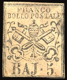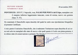 PONTIFICIO FALSI PER POSTA 1855 - 5 baj rosa, falso per posta di Bologna, II tipo (F3)