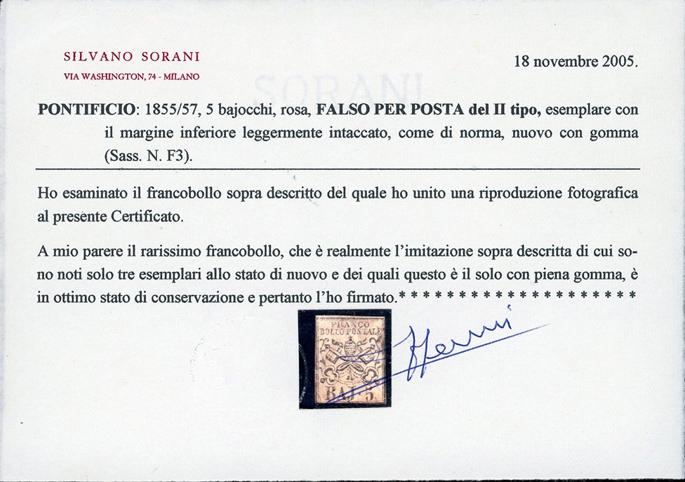 Nuovo con gomma, in ottimo stato di conservazione. Dei tre esemplari conosciuti allo stato di nuovo, questo è l'UNICO CON GOMMA. Grande rarità. Cert. Sorani. Cat. €195.000