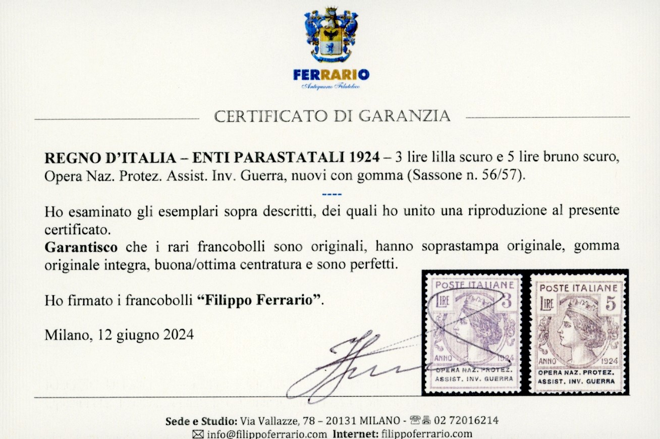 Nuovi, gomma originale integra, perfetti e molto freschi. Il 5 lire ben centrato e il 3 lire ottimamente centrato. Rari di questa qualità. Cert. Ferrario e Giulio Bolaffi (cat.Sassone € 65.500/102.500).