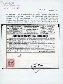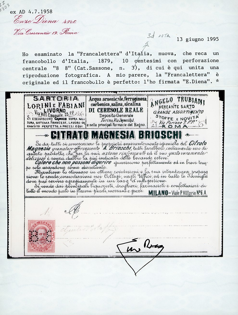 Su busta francalettere nuova, perfetta, consueti tagli di rasoio sul francobollo per impedirne l'asportazione. Splendida e molto rara. Giulio Bolaffi per esteso, A.Diena, cert. Zanaria, E.Diena e Sorani. Cat. € 55.000