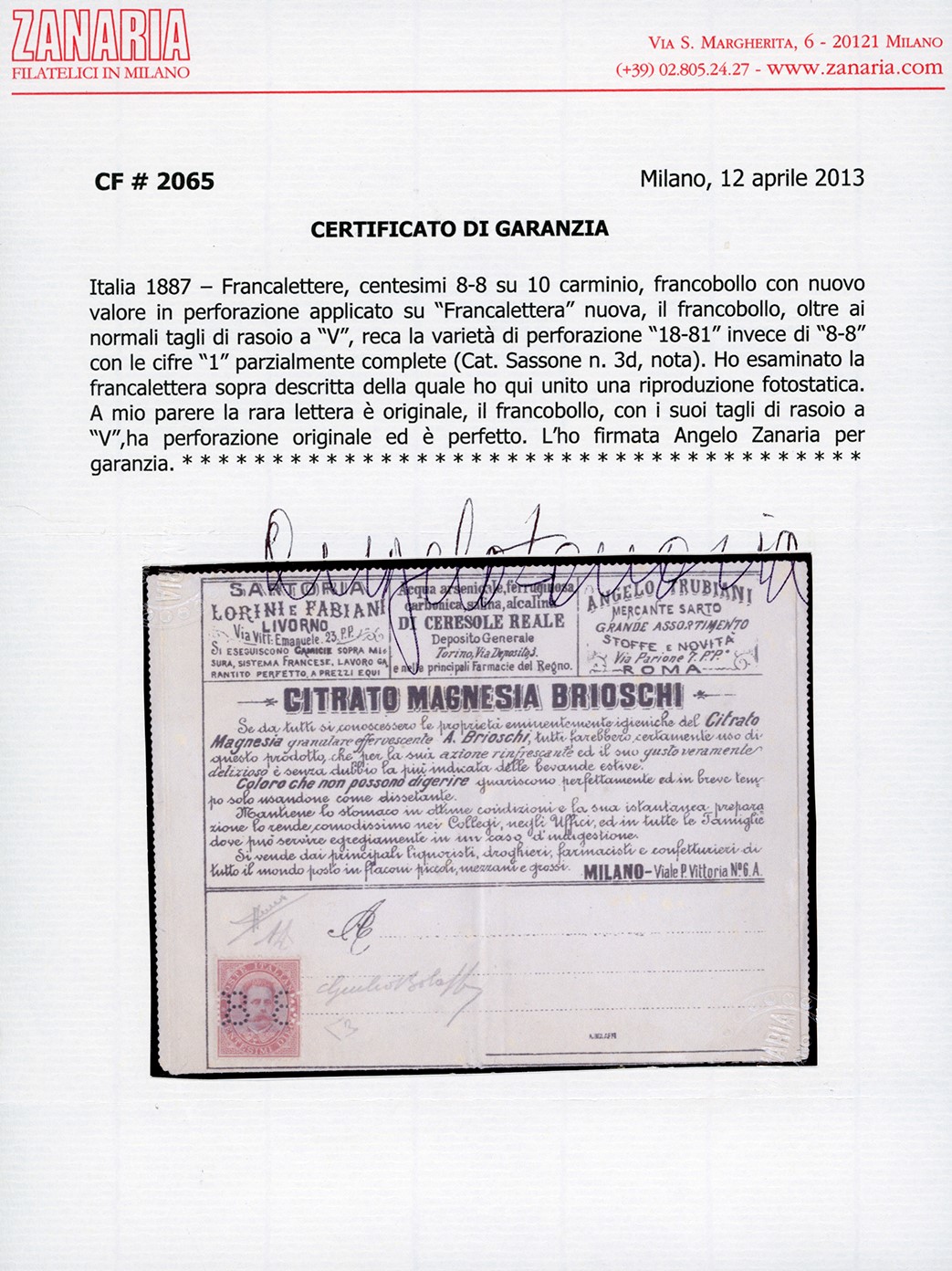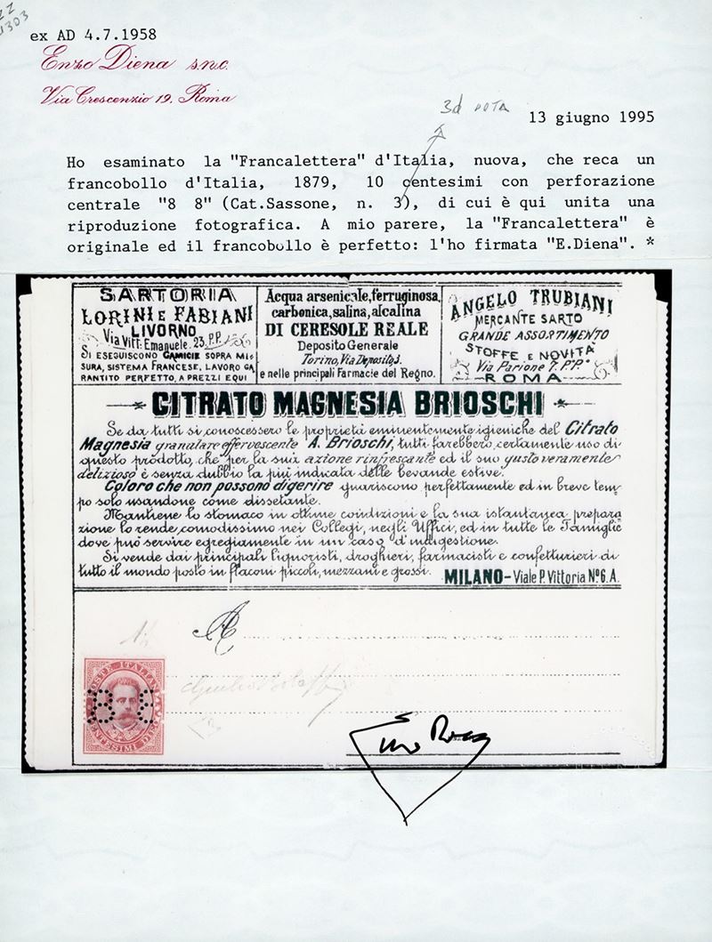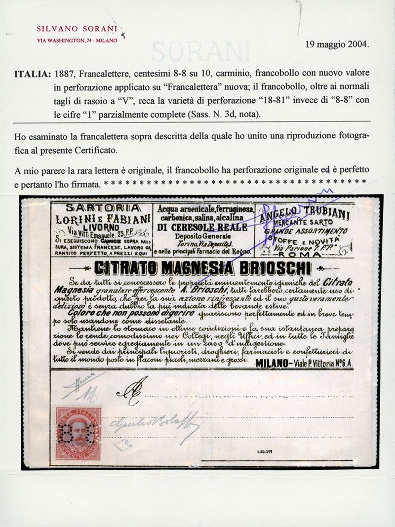 REGNO D'ITALIA - FRANCALETTERE 1887 - 8-8 su 10 cent., errore di perforazione "18-81" con le cifre "1" parzialmente incomplete [..]