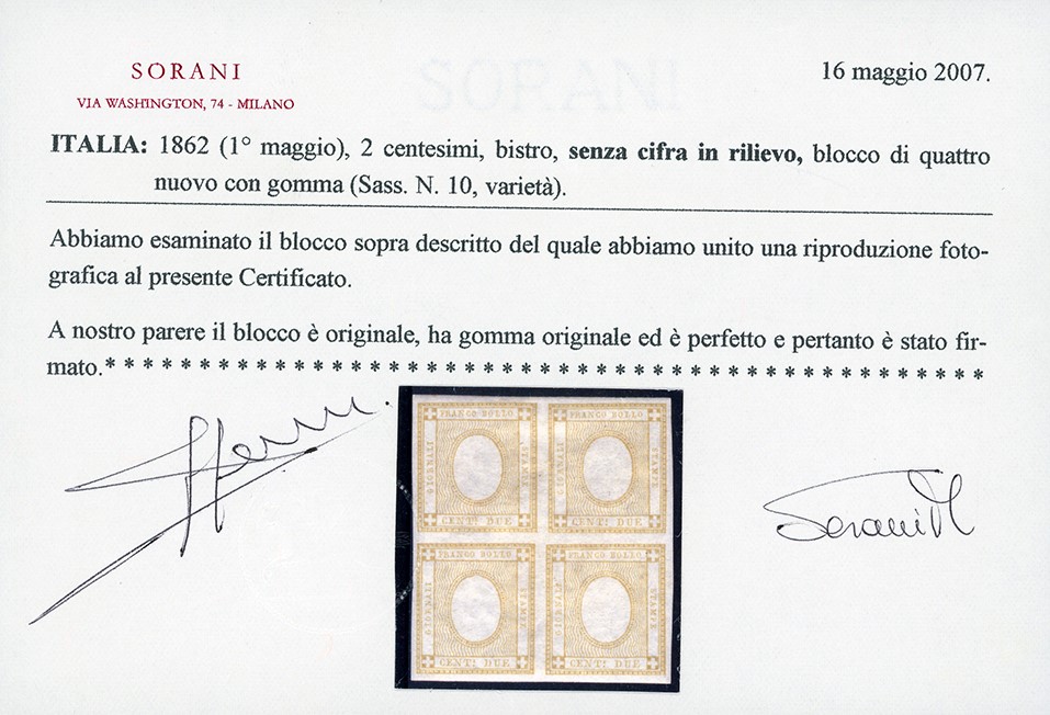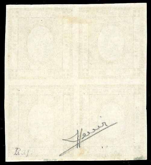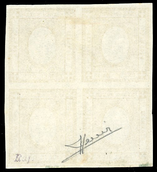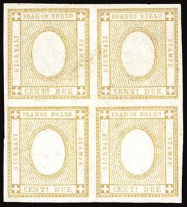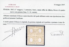 REGNO D'ITALIA 1862 - 2 cent. bistro, SENZA CIFRA IN RILIEVO (10eb), blocco di quattro