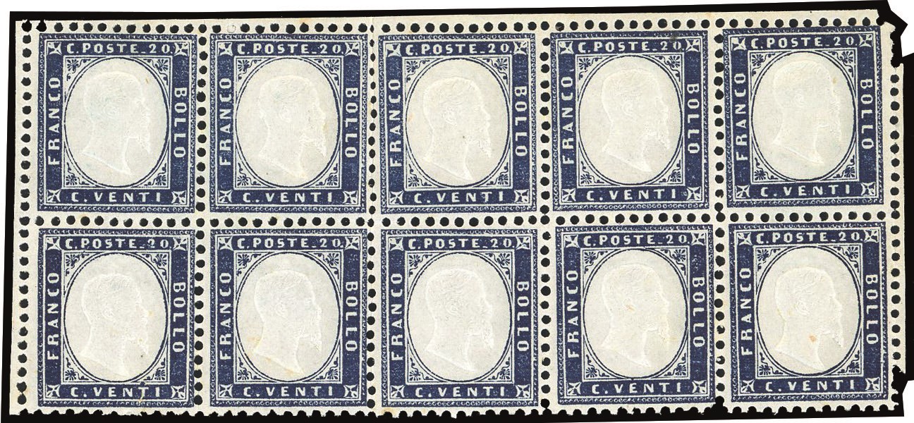 REGNO D'ITALIA 1862 - 20 cent. indaco (2), blocco di dieci esemplari