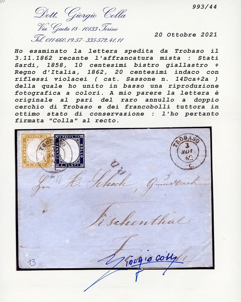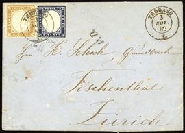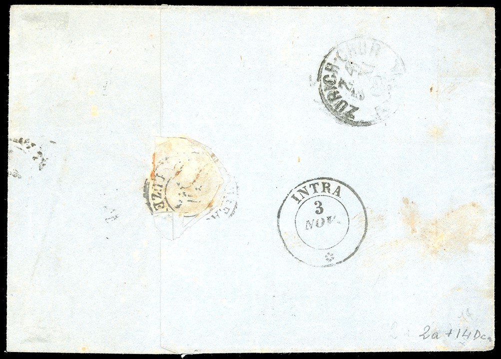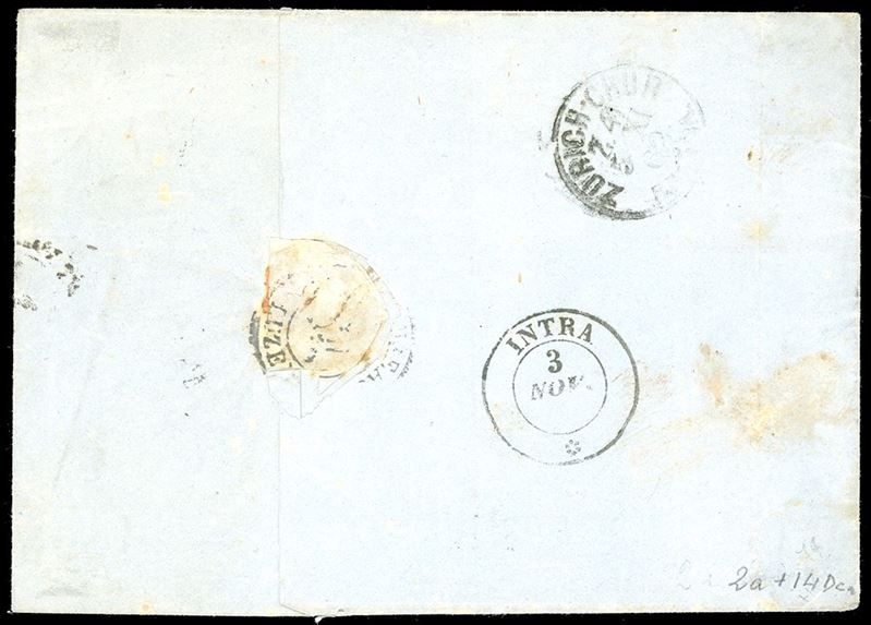 Perfetto, su lettera da Trobaso 3/11/1862, punti 13, a Zurigo, Svizzera. Raro insieme. A.Diena, cert. Colla. Cat. € 10.400