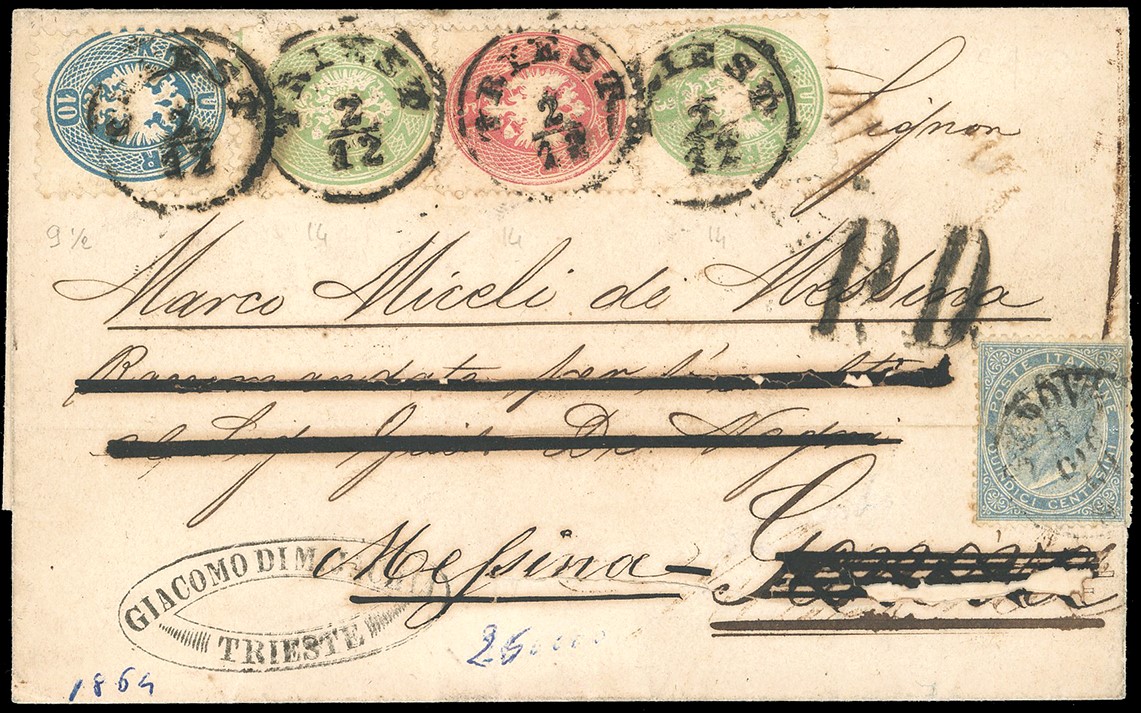 Perfetti, su lettera da Trieste 2/12/1864 a Genova, dove venne riaffrancata con 15 cent. De La Rue (L18), piega orizzantale, prima di essere rispedita a Messina. Rara affrancatura tricolore mista di rispedizione.