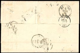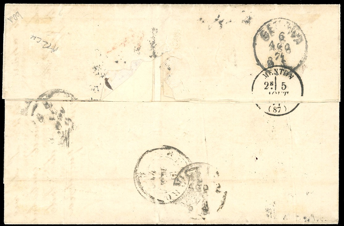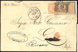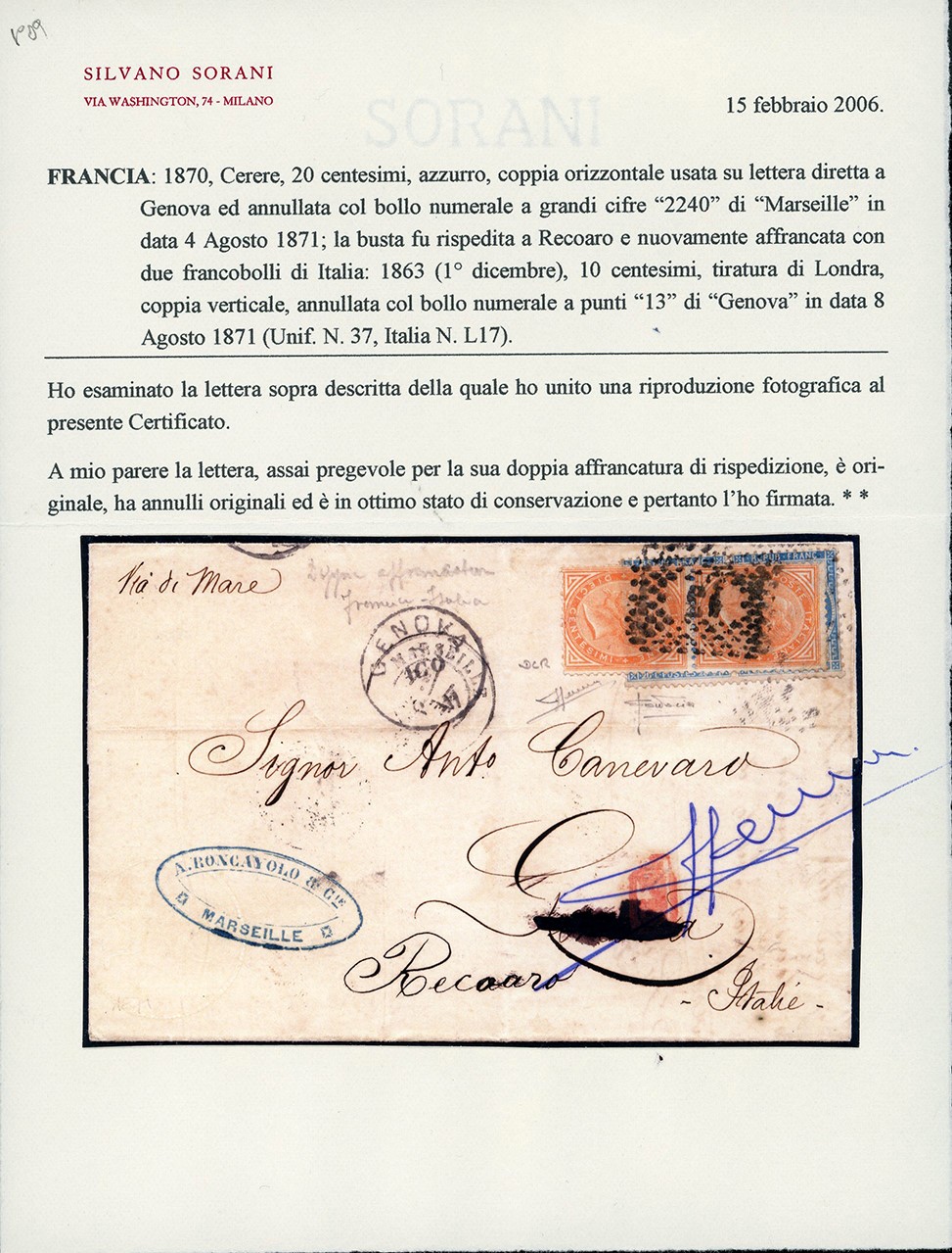 Su lettera da Marsiglia 4/8/1871 a Genova, dove venne rispedita il successivo 8/8/1871 a Recoaro, previa riaffrancatura con 10 cent. De La Rue, tiratura di Londra, coppia orizzontale. Pregevole affrancatura mista di rispedizione, in ottimo stato di conservazione. Cert. Sorani.
