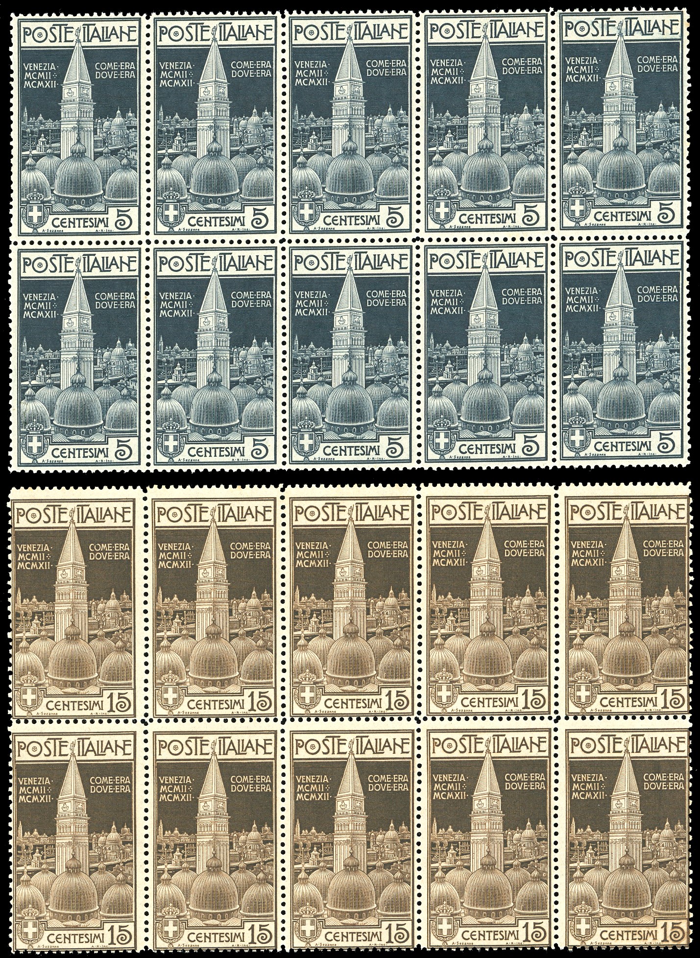 REGNO D'ITALIA 1912 - Campanile di Venezia, serie completa (97/98), blocchi di 10 esemplari