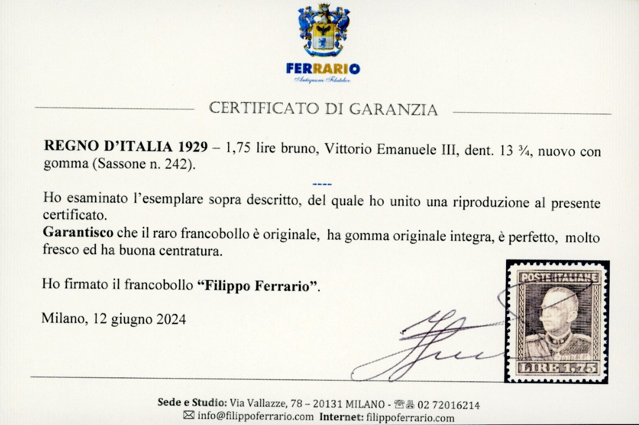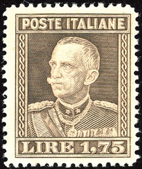 REGNO D'ITALIA 1929 - 1,75 lire bruno Vittorio Emanuele III, dent. 13 3/4 (242)