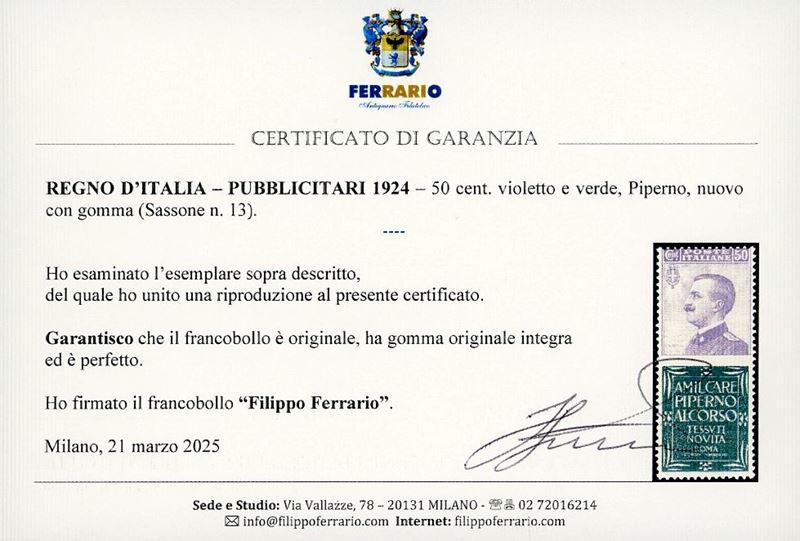 Nuovo, gomma originale integra, perfetto. Cert. Ferrario. Cat. € 8.000
