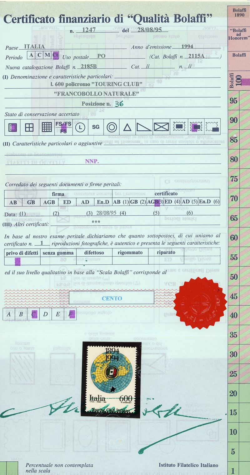 Dentellatura orizzontale fortemente spostata in basso, "Touring in basso", francobollo naturale (Sassone 2131a,Bolaffi 2258B punti 115), nuovo, gomma originale integra, perfetto. Molto raro. Cert. Finanziario Bolaffi 100%, fotocopia cert. Diena del foglio di provenienza. Cat. € 10.000