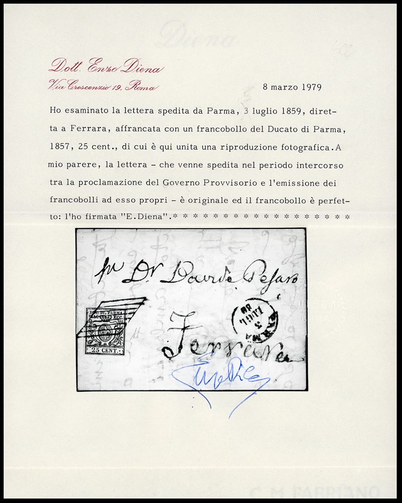 Perfetto, su fresca lettera da Parma 3/7/1859 a Ferrara. Pregevole lettera dal Governo Provvisorio di Parma a quello delle Romagne, di ottima qualità. A.Diena, cert. E.Diena. Cat. € 22.000+