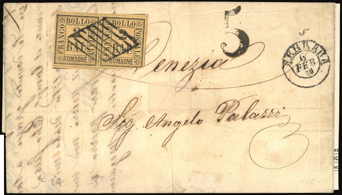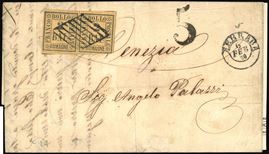 Coppia perfetta, su lettera da Ferrara 6/2/1860 a Venezia, tassata 5 soldi. Ferrario. Cat. € 5.500